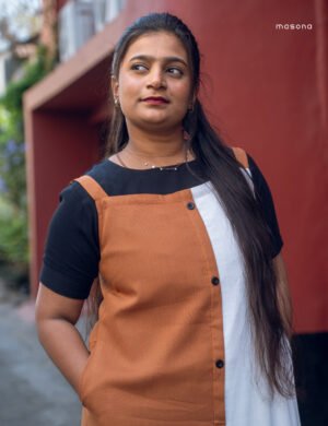 ₹8990 out of 5“colour blocked straight cut kurti featuring a burnt orange and ivory panel with contrasting black inner,finished with a front button placket for a modern everyday look”.