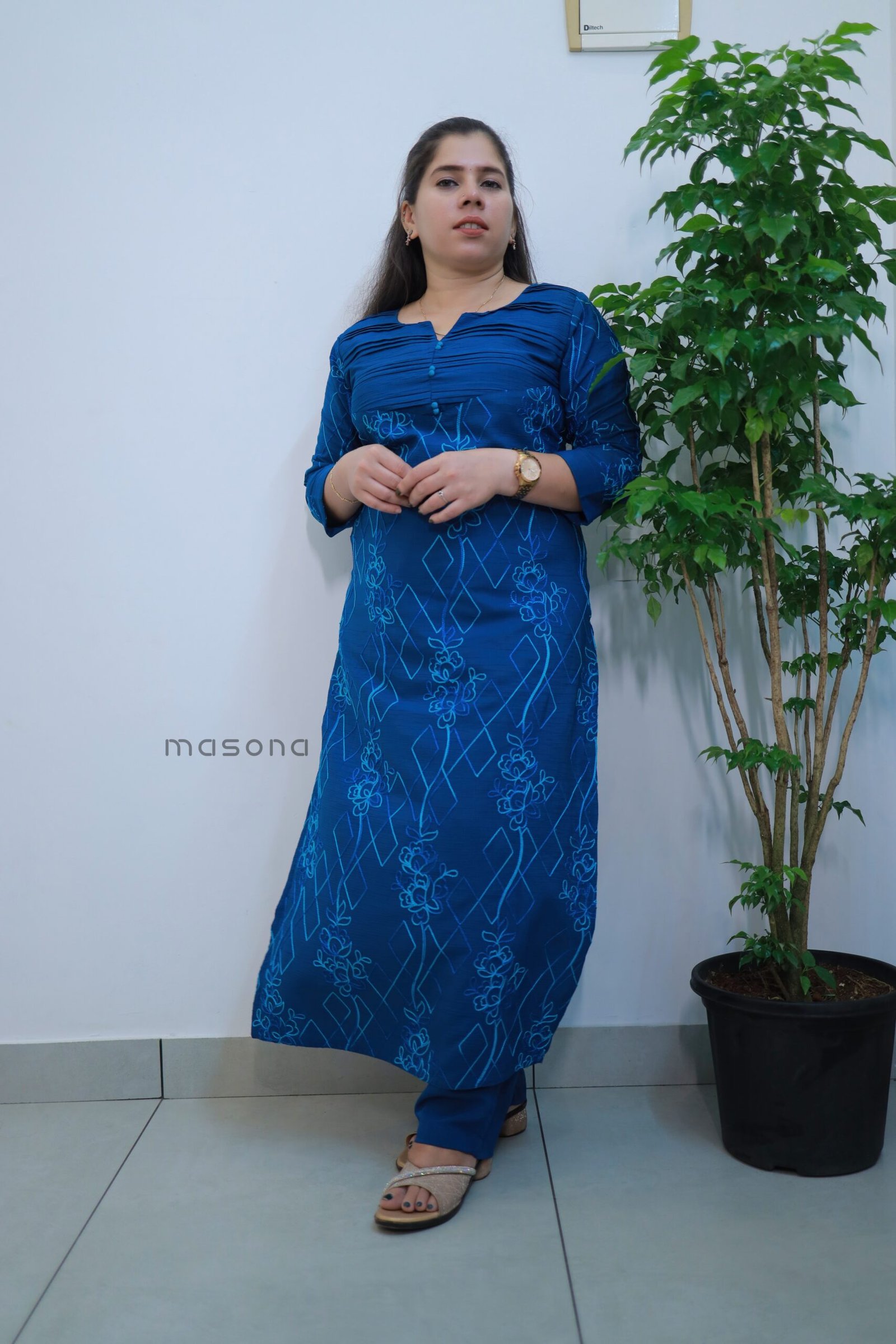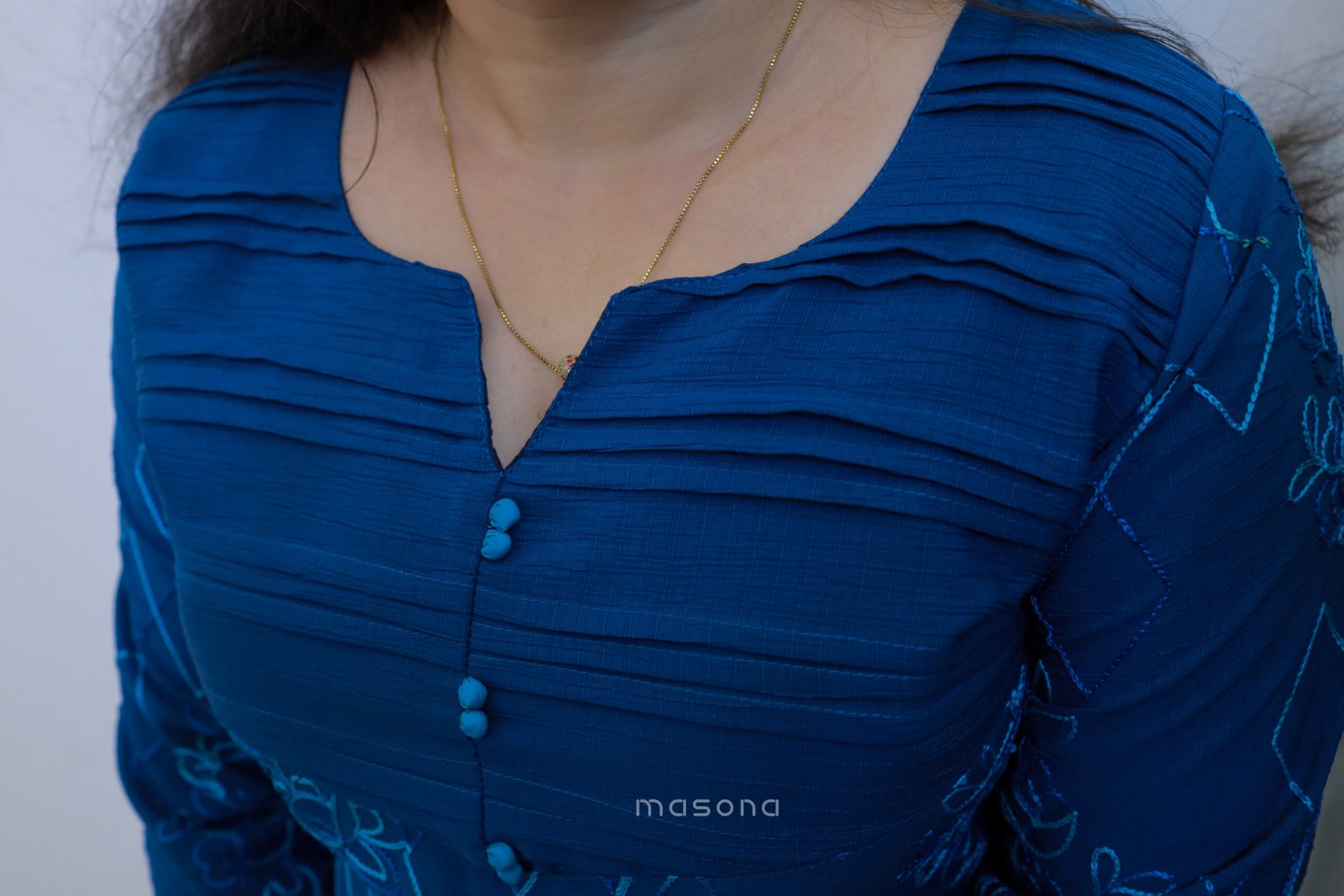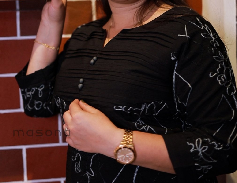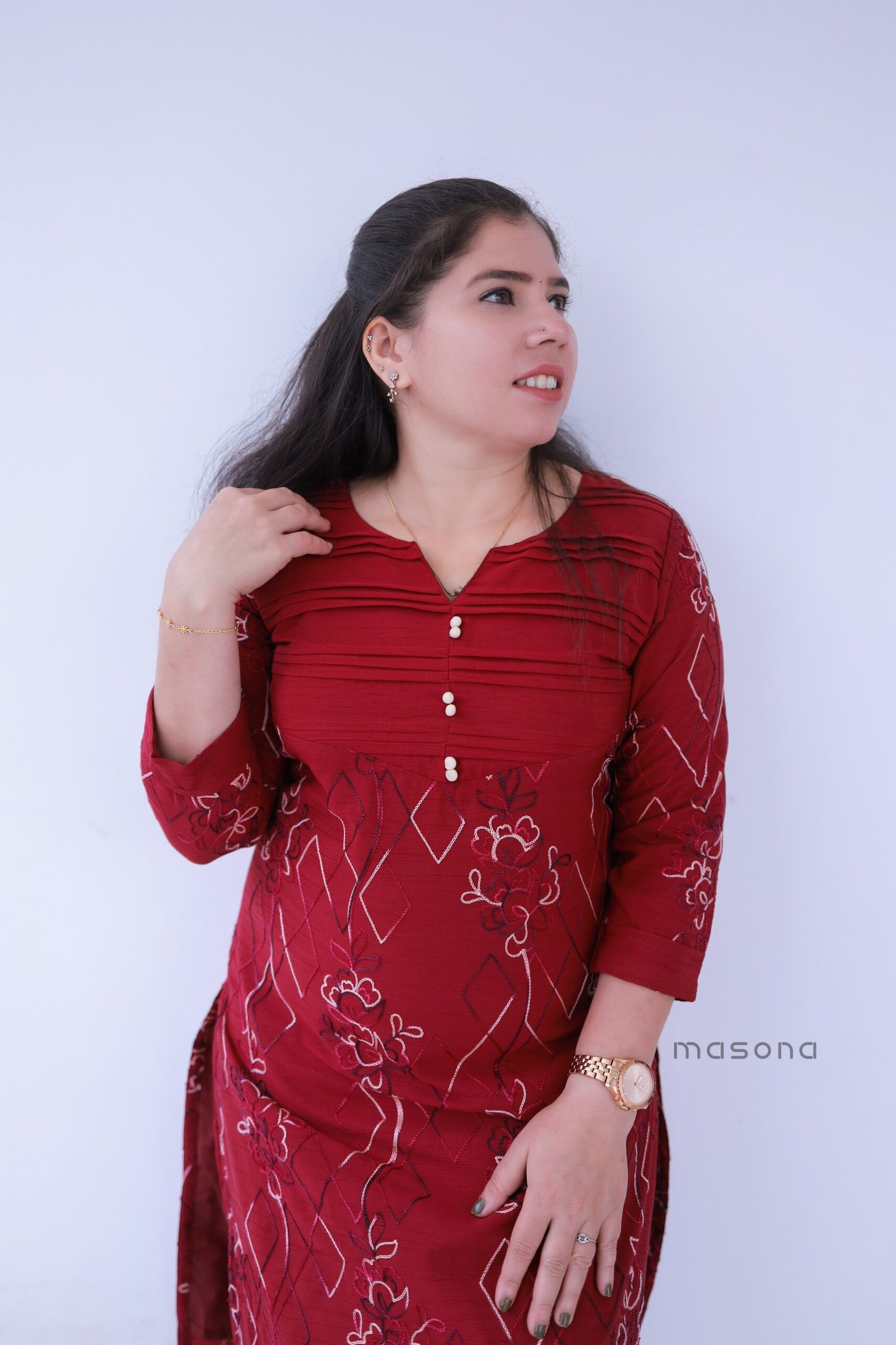Step into elegance with this aari work kurti featuring a pintuck yoke design, contrast and combination thread work all over the body, and a neatly placed button on the chest. Crafted from AI crush fabric, it’s perfect for casual outings, office wear, family gatherings, or festive occasions.