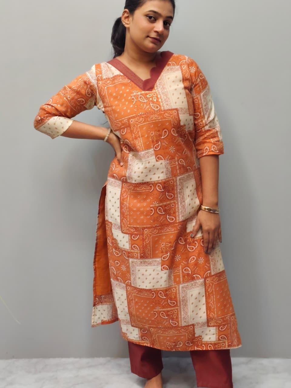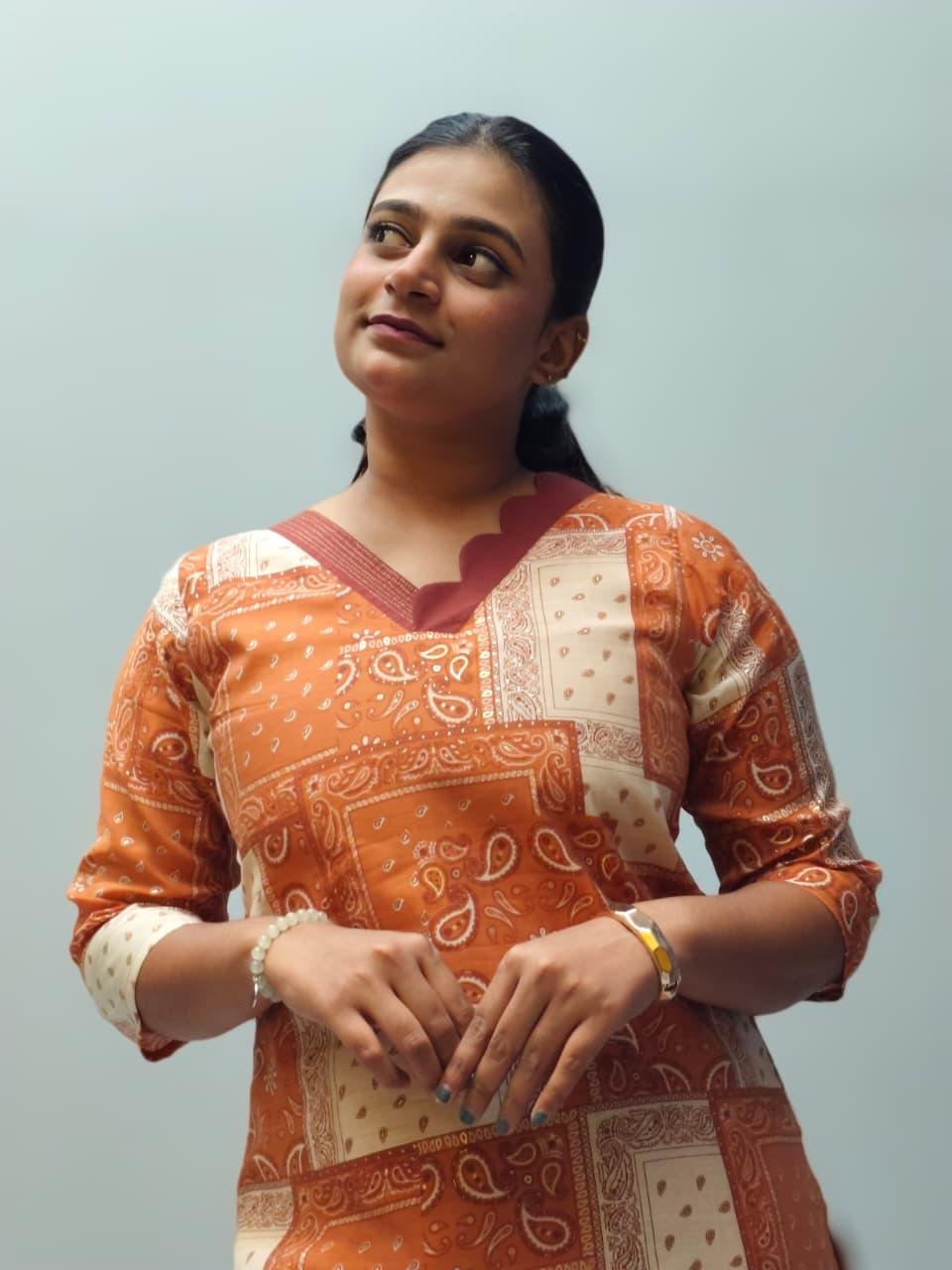 This stylish eye catching patchwork bandhani print that blends modern charm with traditional look, Designed with a scalloped V neckline, 3/4 sleeve and a straight cut silhouette, it offers a comfortable yet elegant look.