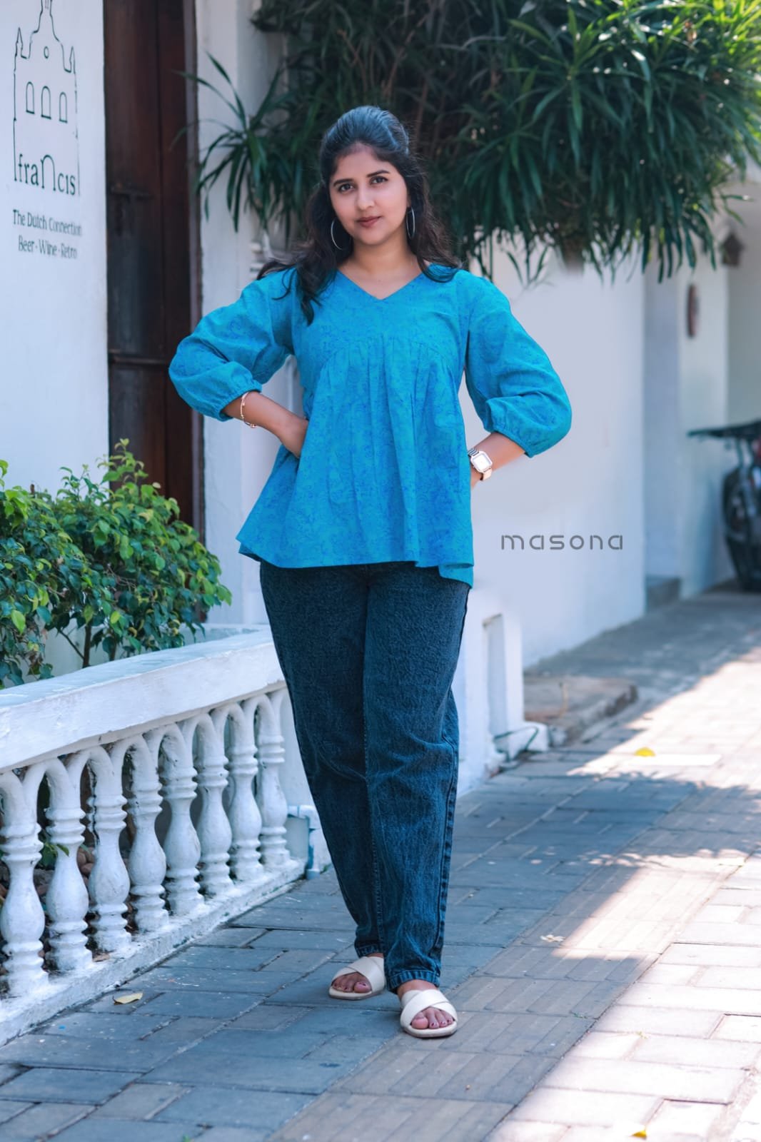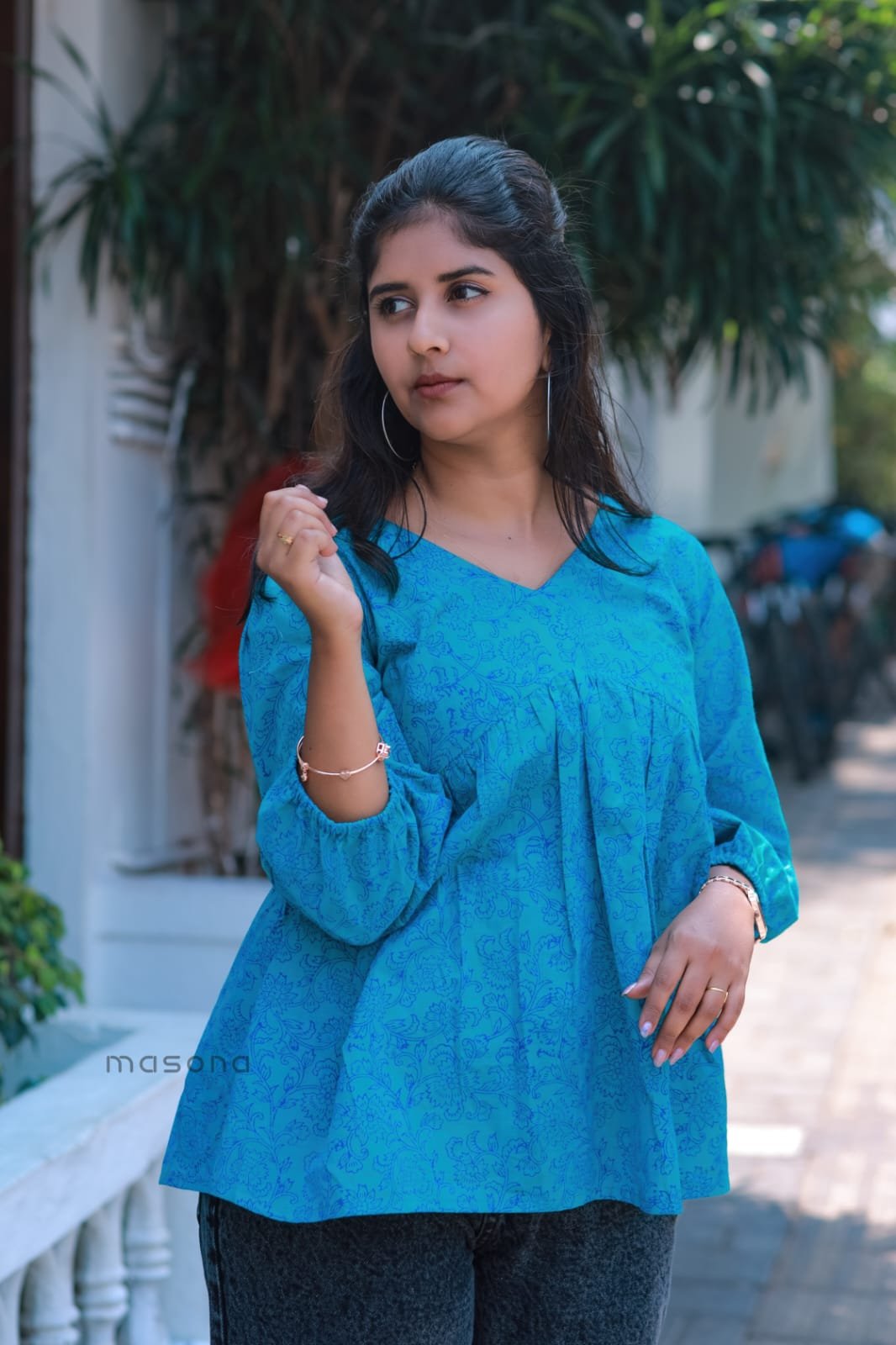 South Cotton V-neck Gathered Short Top with Balloon Sleeves – M1797